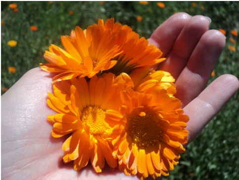 Cueillette de fleurs de Calendula pour la préparation de baumes et d’infusions maison